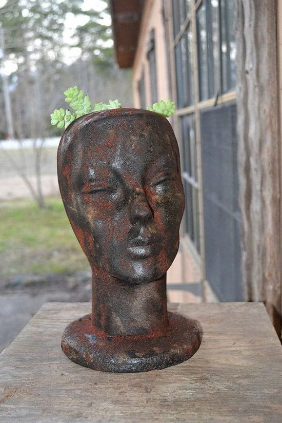 Search your nearby local stores or wig stores for a styrofoam head mannequin and plant succulents inside it. To learn how to give it a faux rusty look, click here.