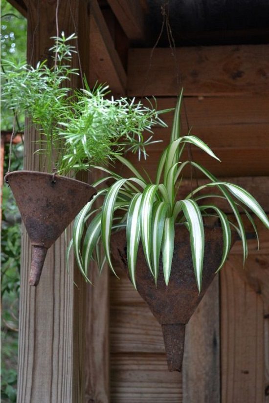 Repurpose oxidized metal funnels into planters in no time. Line the bottom with landscaping fabric or something similar to block the soil from falling and plant any low maintenance plant. Use wires to hang them. It s just that simple.