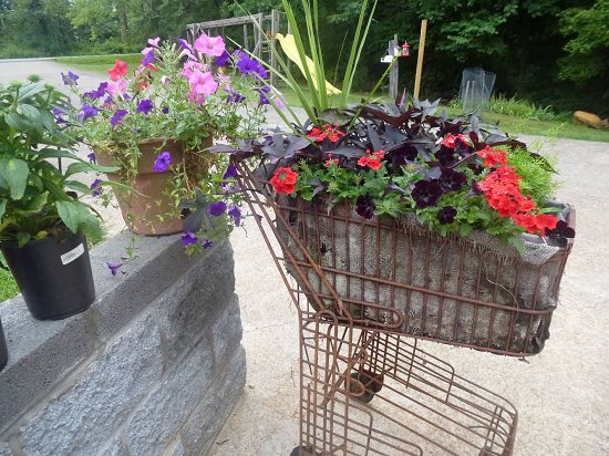 How about filling a useless shopping cart with contrasting flowers? We found the idea here.