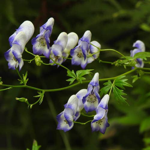 Also known as monkshood due to the resemblance of upper sepals of the florets with monk s hood. The white petals have interesting purple veins.
