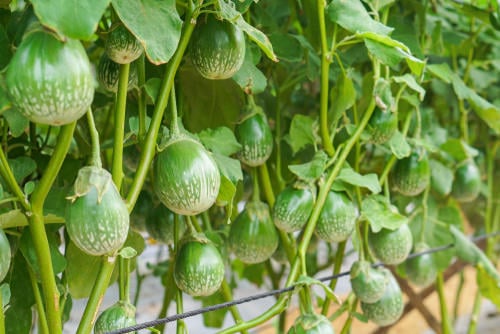 This small eggplant type is very common in Thailand and is found in shades of purple, white, and green. To neutralize its bitterness, get rid of the seeds before you cook.
