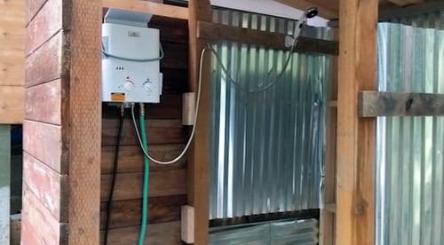 Watch this video to learn how to make a temporary outdoor shower using a portable water heater in the backyard.