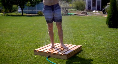 This DIY can be a good summer vacation project. All you need is a copper pipe for water connection, decking boards for a mini floor, along with few other supplies.