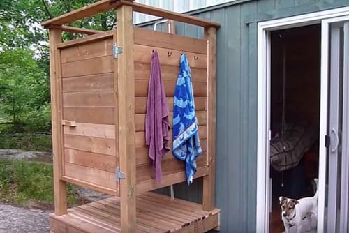 If you want a little privacy in your outdoor shower, then this is the one to make with wooden sidewalls. Click here for details.