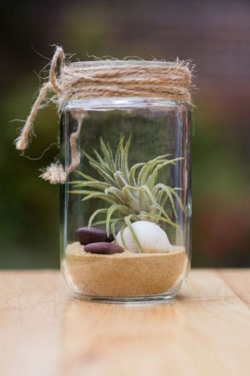 A cute air plant in a glass jar with a roped lid looks eye-catching.