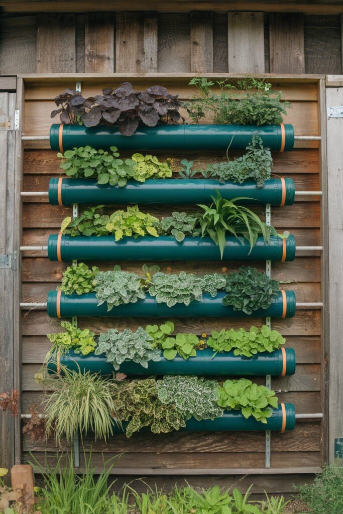 - Fill the pipes with soil and plant herbs, strawberries, or trailing plants to add cascading greenery.