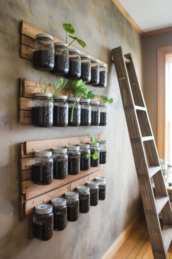 - Fill jars with soil and small plants, such as herbs or succulents, then mount the board on a wall.