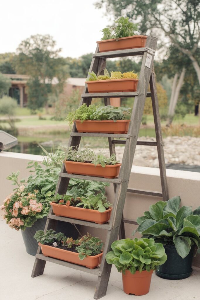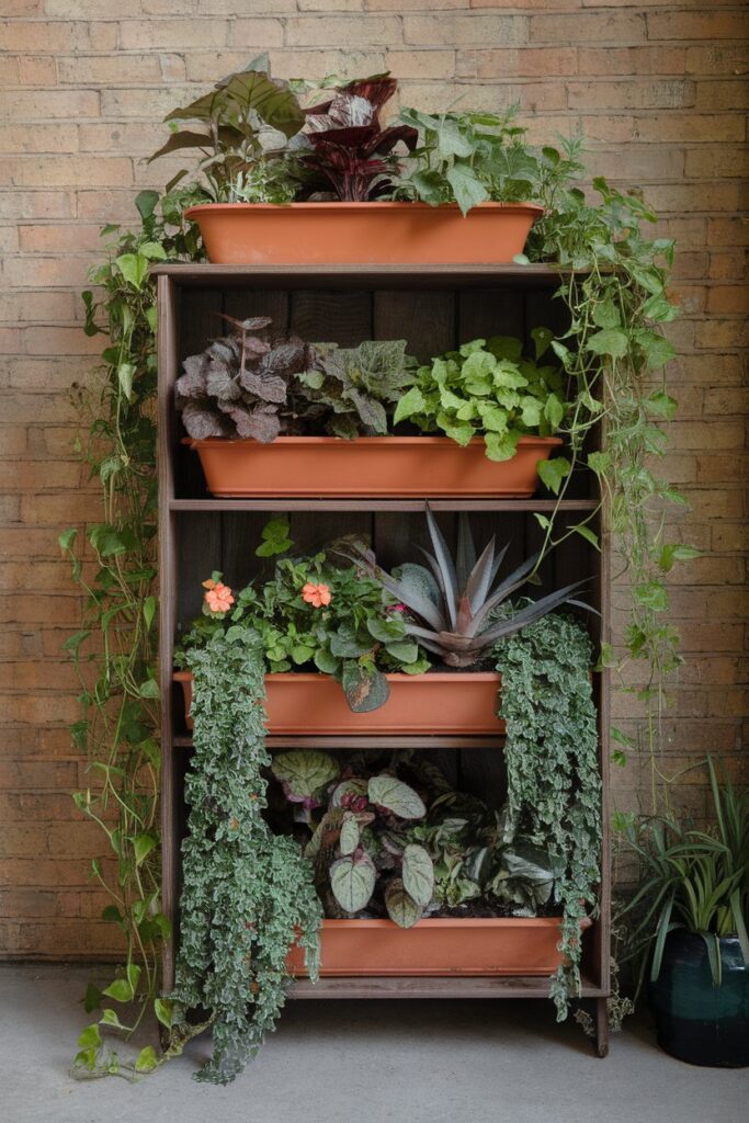 - Arrange pots or planters on the shelves and fill them with your favorite plants for a tiered garden effect.