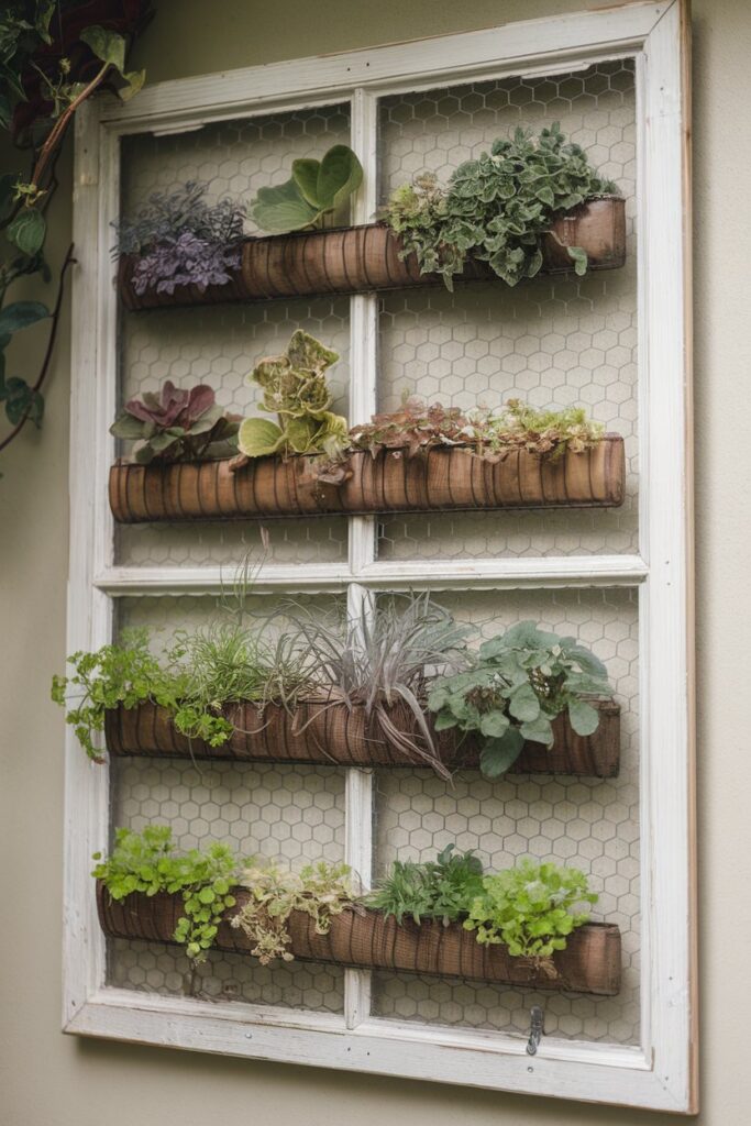 - Attach mesh or chicken wire to the back of the window frame to hold planters.