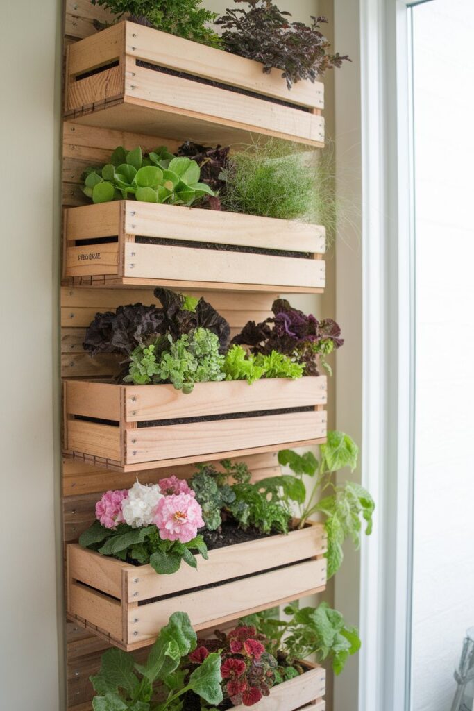 - Fill each crate with soil and plant flowers, herbs, or vegetables.