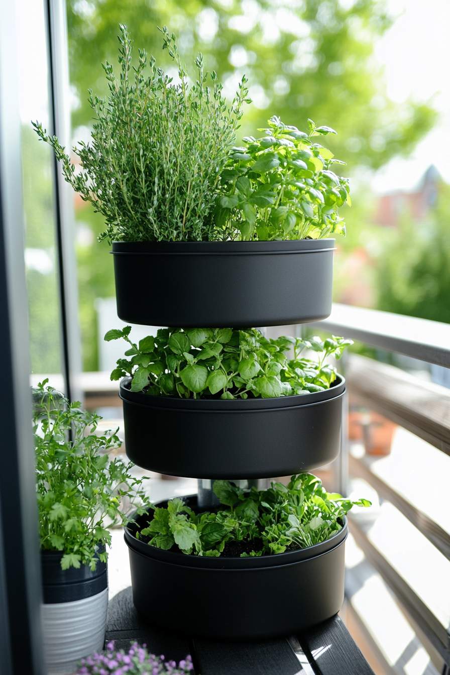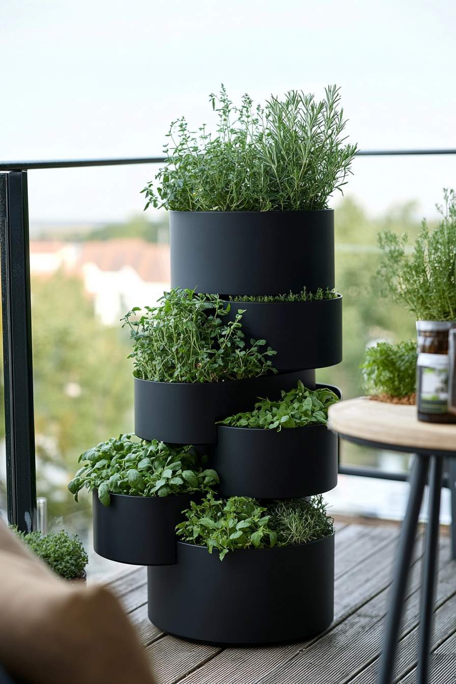 - Purchase stackable planters and place them in a sunny corner of your balcony.