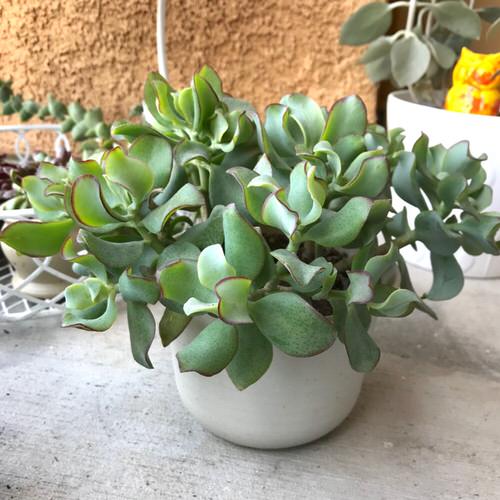 This popular crassula variety shows off thick oval coin-shaped dark green leaves it also produces pink-white blooms during winter.