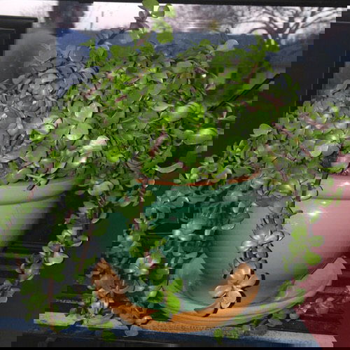 This beautiful succulent offers maroon stems filled with round coin-like fleshy leaves it cascades over walls and achieves great length.