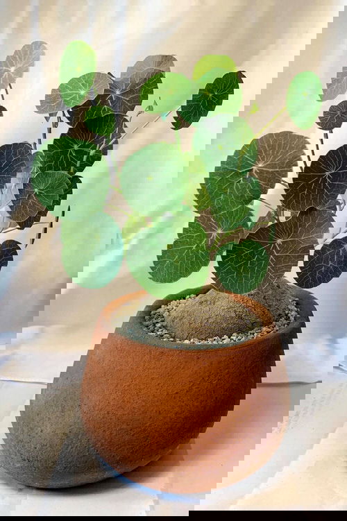 This beautiful, easy-to-grow pilea variety showcases soft pink-red stems carrying clusters of coin-shaped blue-green leaves.