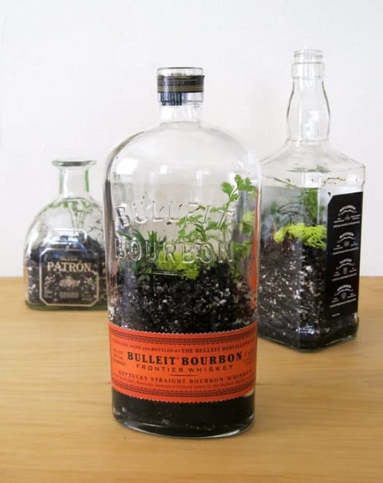 Choose some vintage liquor bottles to upcycle them into a terrarium using soil and plants. We found the idea here.