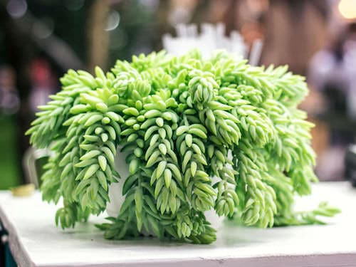 One of the most beautiful trailing succulent, this features pendant stems and short, light green foliage that trails beautifully on the edges of hanging baskets.