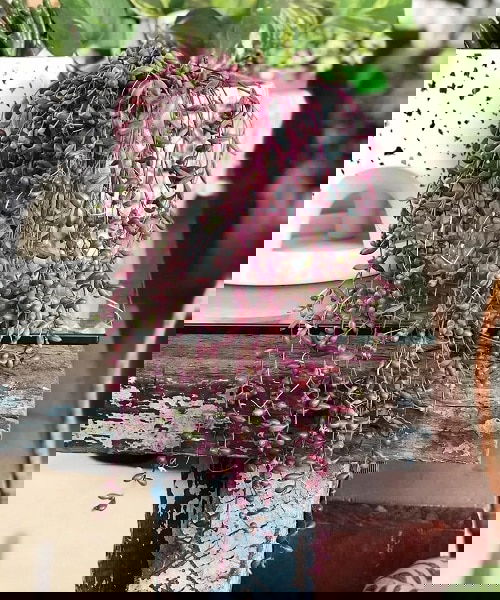 This strikingly pretty succulent is distinguished by maroon or dark green stems covered with round, fleshy foliage that cascades beautifully over the rims of baskets.