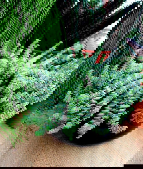 If you love cascading succulents, then this one is for you! Its leaves have red margins and are densely arranged on thin stems, reminiscent of a beautiful necklace.