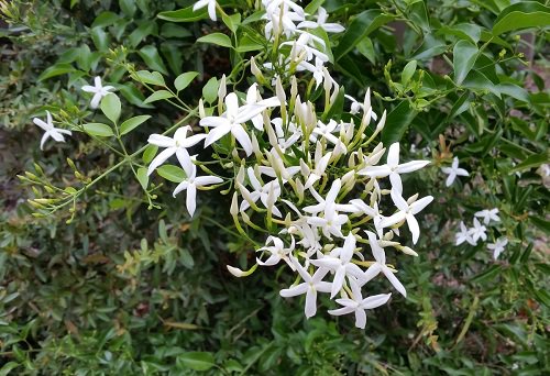 Also known as True or Poet s Jasmine, it is a state flower of Pakistan and grows commonly in the Indian subcontinent. This shows off the five-petaled with pointed leaves.