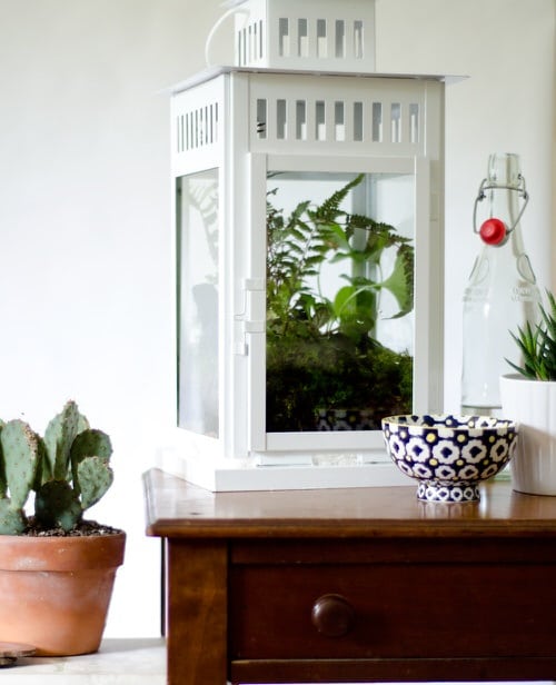 This Ikea BORBY lantern can be made into a terrarium to grow fern or other small shade-dwelling plants with moss.