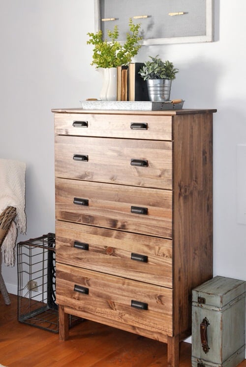 Give a rustic look to a Tarva Dresser with a special walnut stain and use it to place pots on the top.