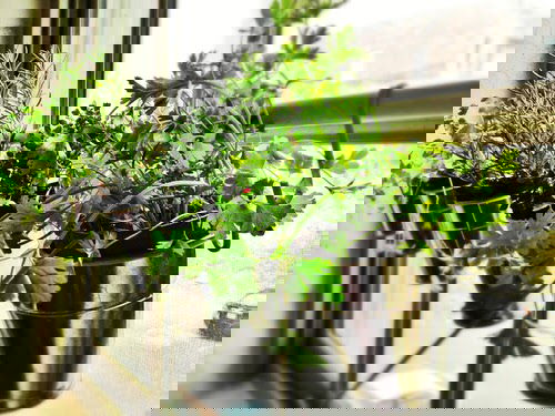 Get curtain rods and hooks from an IKEA store and hang metal planters on your apartment window to grow herbs of your choice.