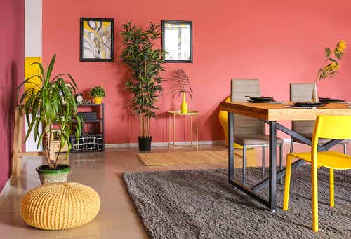 Yellow furniture matches perfectly with pink walls and the addition of plants adds a subtle touch of green to the dining room.