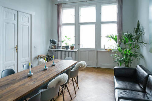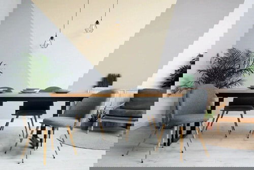 A studio cum dining room is a great place to work and enjoy meals in the vicinity of a plant by the window!
