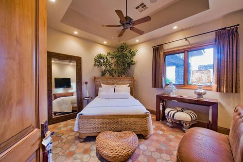 Give a resort-like look to your bedroom with plants behind the bed and a large mirror.