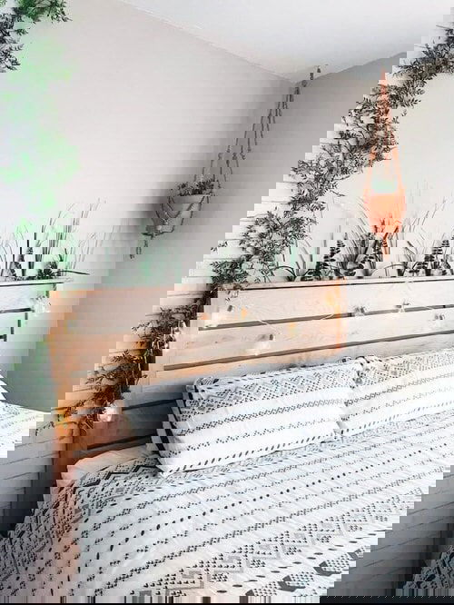 A bedroom with hanging tin planters behind the bed and a side shelf full of plants will give it a mini jungle look!