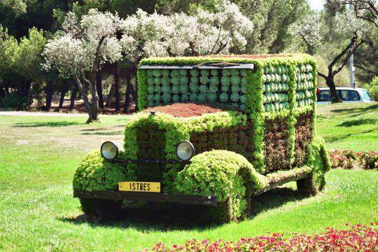 To copy this idea, grow vines in the engine bay and raise the hood. Plants cascading down will look great.