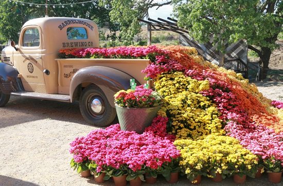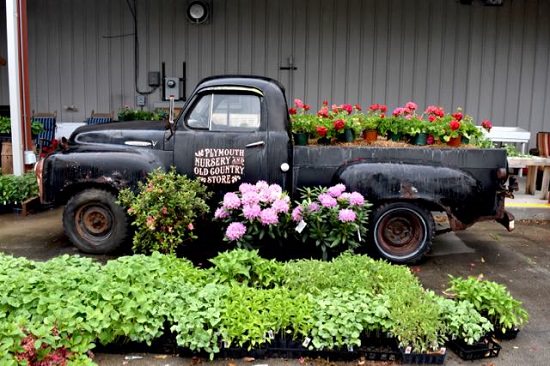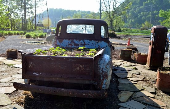An old pickup truck used to hold flower pots. A great focal point idea!