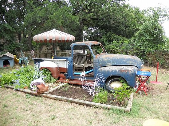 Get a truck from a junkyard and fix a wooden bench and plastic umbrella over it. Add some wired sculptures to make one of the best sitting places in your garden.