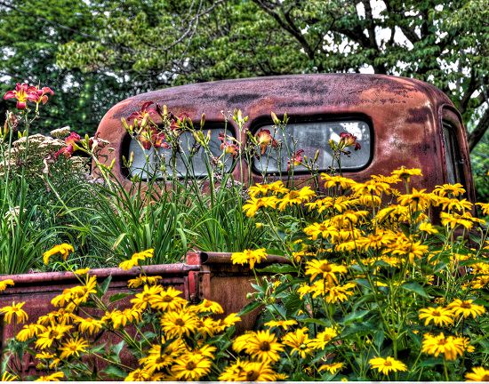 How about using a wrecked truck as a raised garden bed to grow your favorite plants!