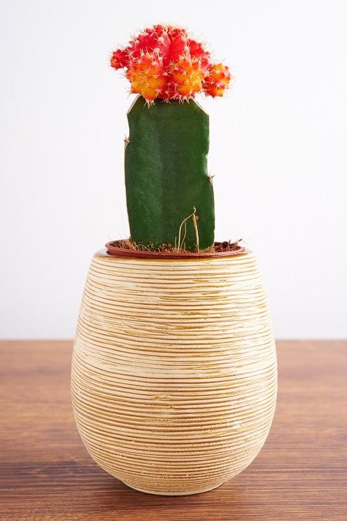 This slow-growing cascading cactus has thin, long, intertwined stems. It also looks amazing in hanging baskets. Keep it where it can get partial to full shade.