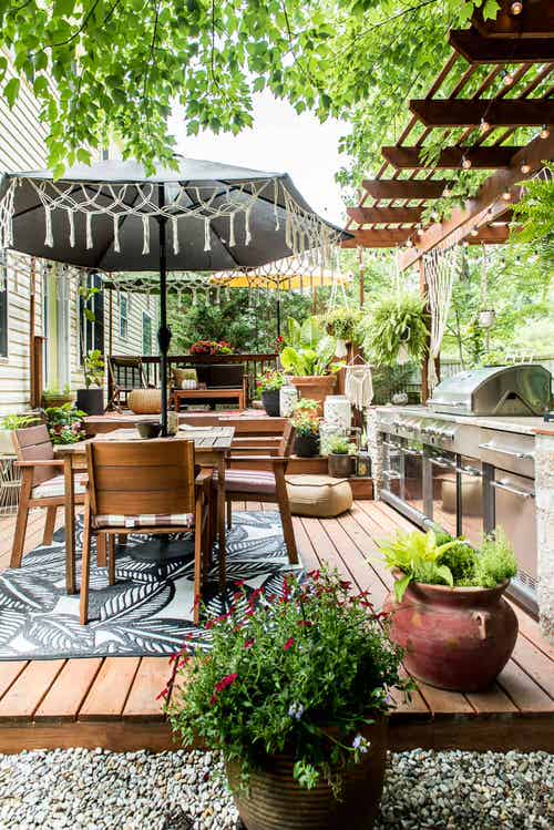 A patio with wooden flooring will look a lot better with potted plants and a large umbrella for chairs.