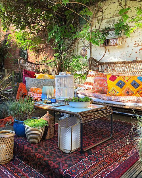 A boho garden with a sitting arrangement, a Buddha statue, and succulents will look simply amazing.