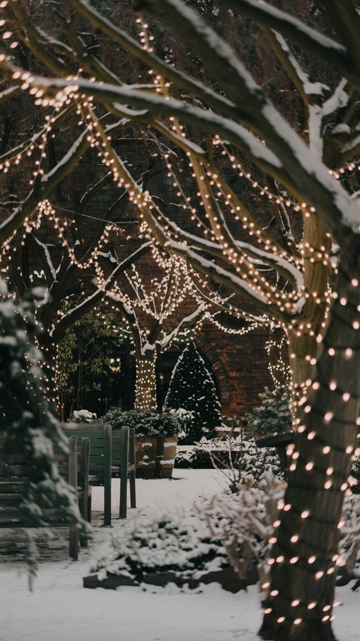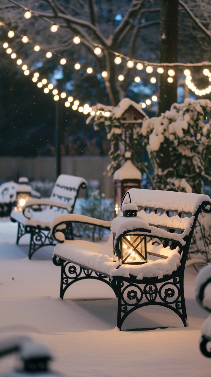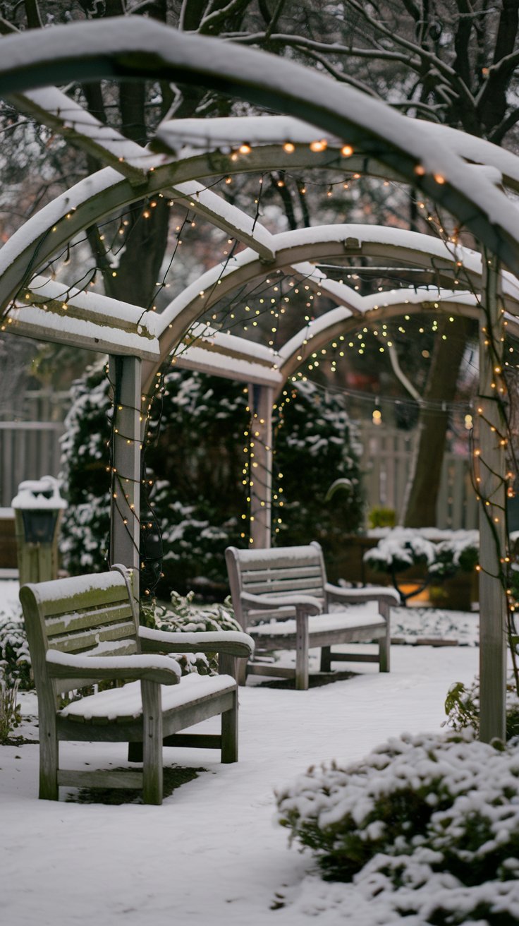 Create a peaceful winter haven with snow-dusted wooden benches beneath twinkling fairy lights. The soft, ambient lighting enhances the tranquility of the scene, making it perfect for quiet moments in the garden. Add a few warm cushions or faux fur throws to complete the cozy aesthetic.