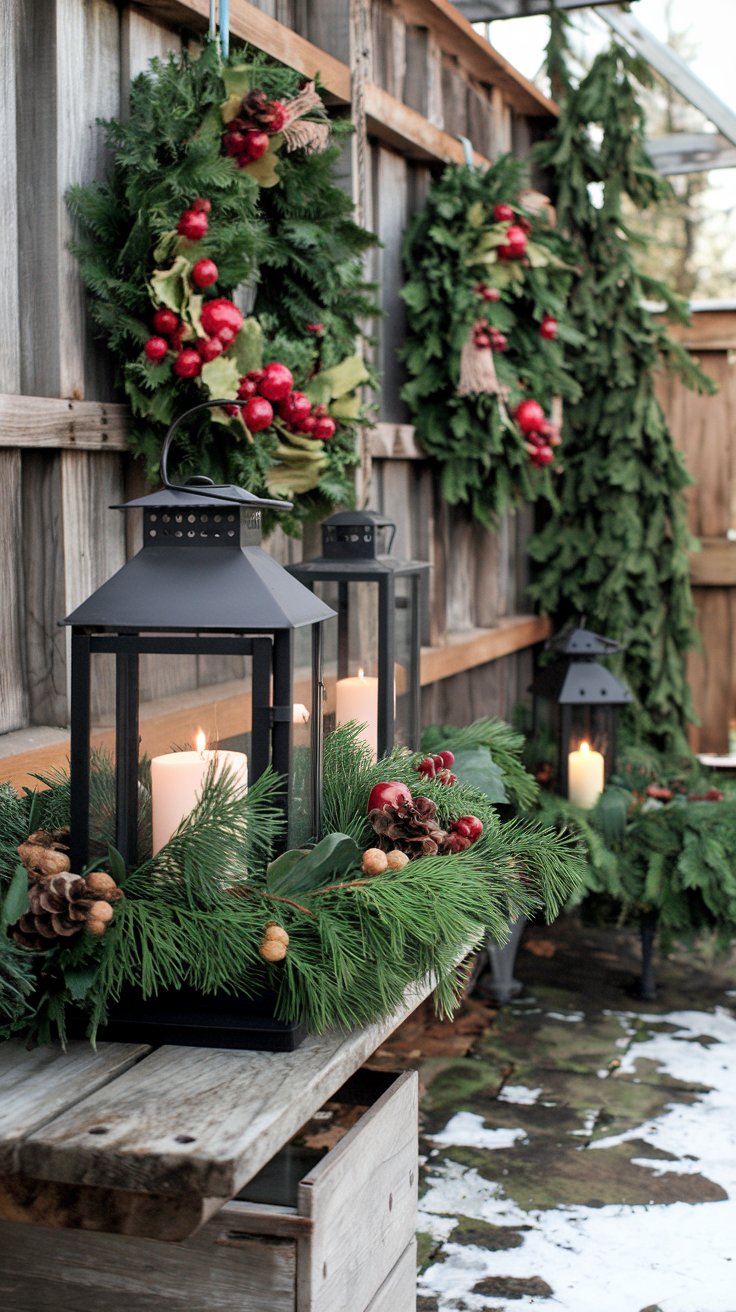 Add rustic charm to your winter garden with lanterns and evergreen wreaths. Place the lanterns on steps, tables, or hang them from hooks to light up the space. Complement the look with lush evergreen wreaths on fences or doors. Together, these elements create a cozy and inviting atmosphere, blending tradition with natural elegance.