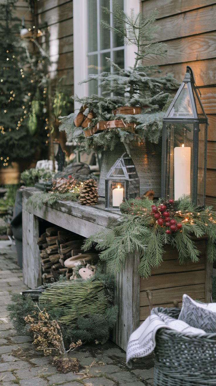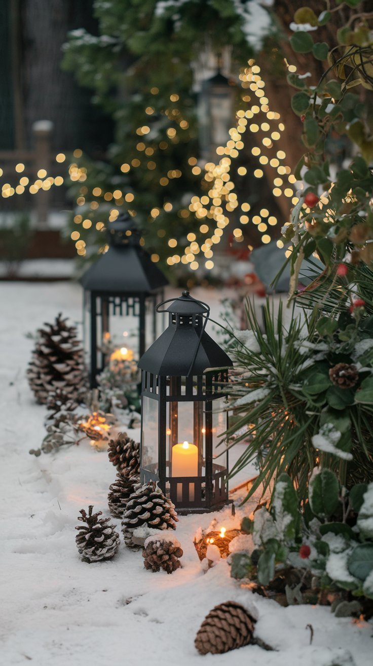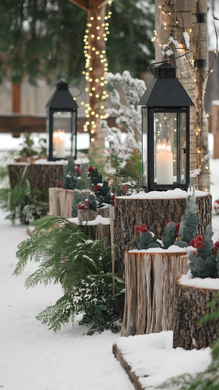 For a warm, earthy vibe, combine lanterns with rustic wooden decor. Use reclaimed wood for benches, planters, or even small decorative sculptures. The lanterns add soft lighting, while the natural wood tones blend seamlessly with the winter landscape. This combination creates a cozy ambiance that feels both timeless and fresh.