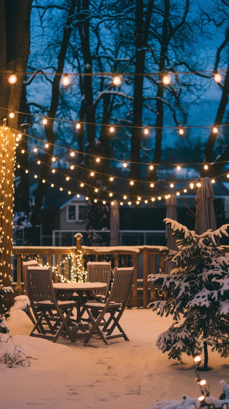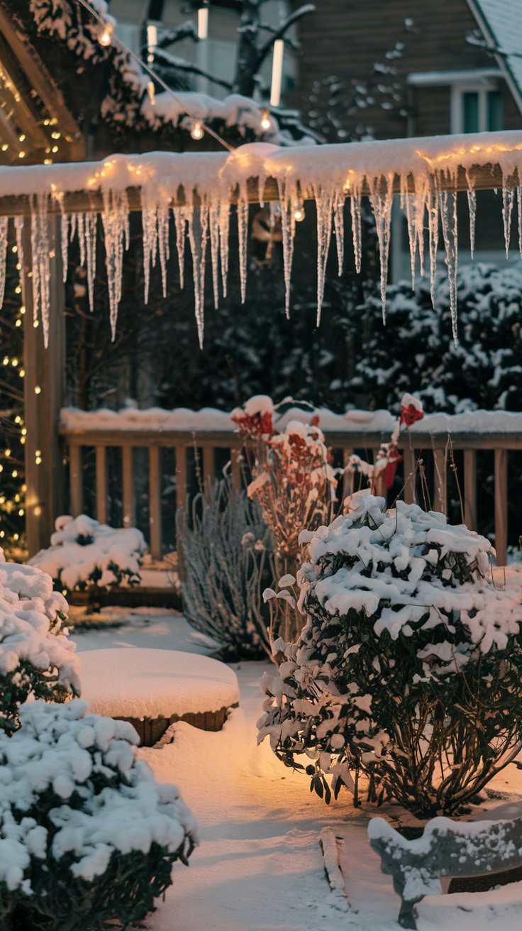Hang icicle lights from tree branches or pergolas to mimic the look of glistening ice. Pair them with snow-dusted plants to complete the winter wonderland effect. This setup creates a mesmerizing atmosphere, perfect for evening garden strolls or hosting a cozy outdoor event.