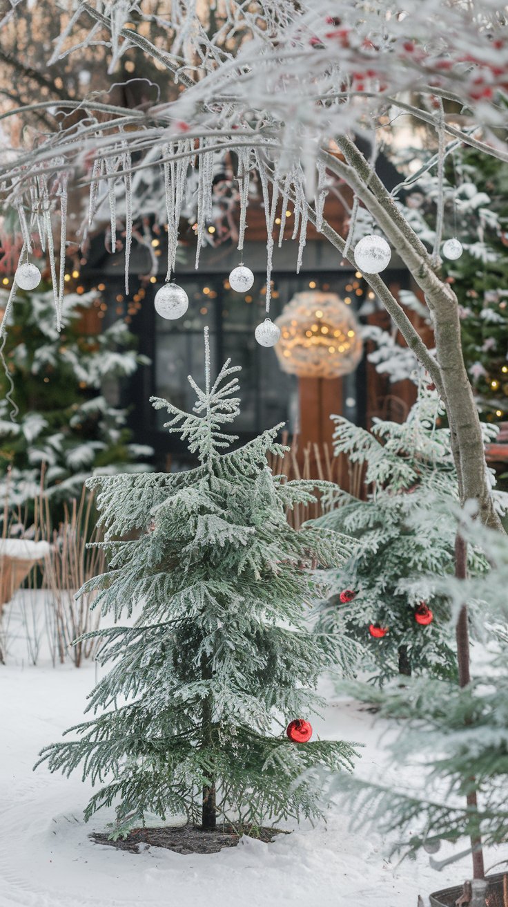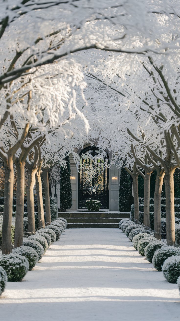 Frame your garden pathways with white frosted trees for an elegant touch. The frosted branches reflect the winter light, creating a breathtaking entrance to your outdoor space. Add soft ground lighting along the path to enhance the magical feel and guide visitors through your winter wonderland.