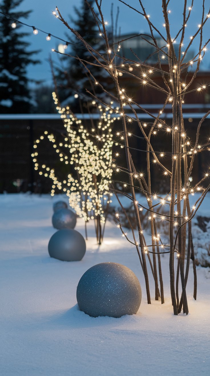Go modern with bold ornaments and sparkling lights that brighten your garden. Opt for oversized ornaments in metallic finishes to make a statement. Pair them with string lights to create a playful yet elegant atmosphere. This idea works well for gardens of all sizes, adding a festive touch to any space.