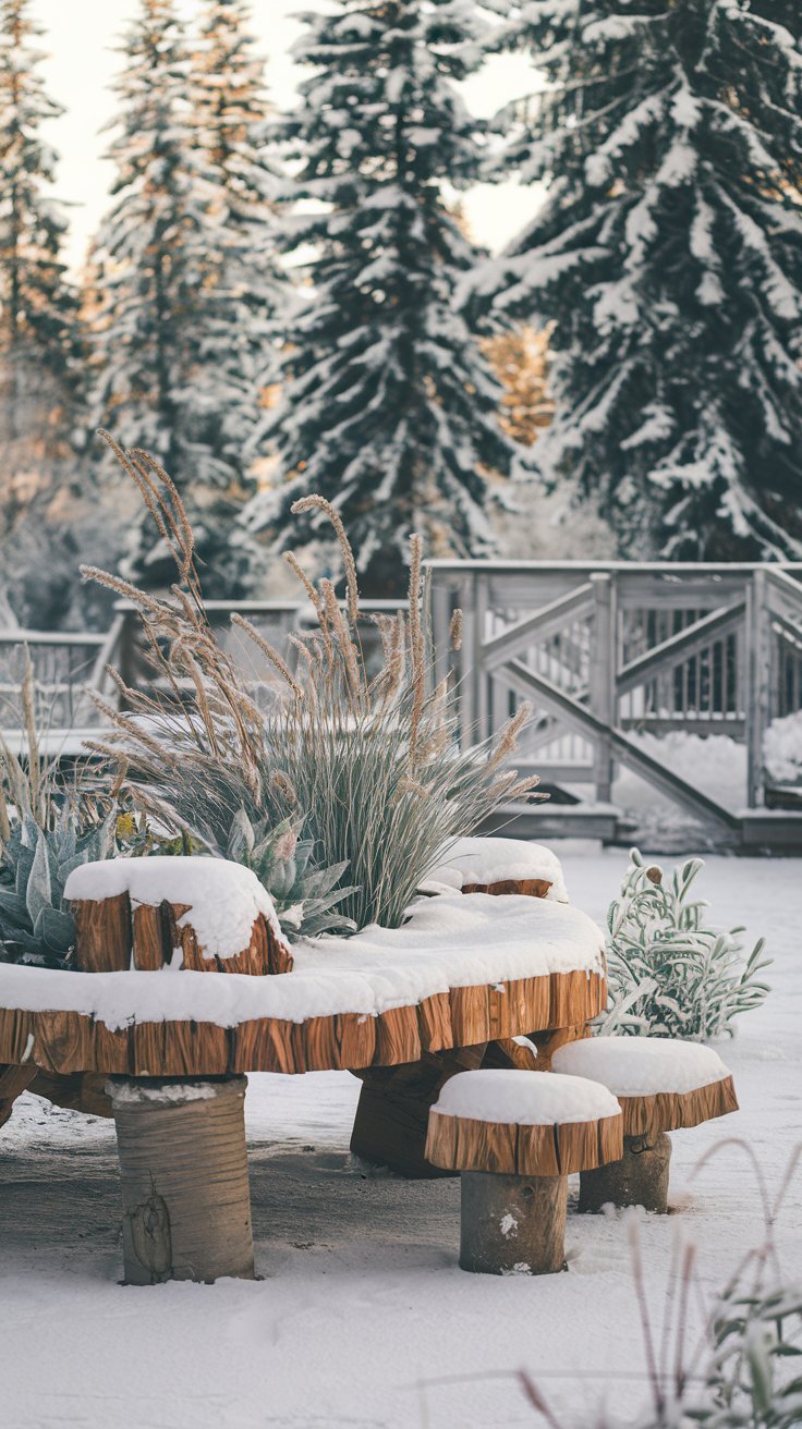 Incorporate rustic wooden elements with evergreen accents for a backyard garden that feels like a retreat. Use wooden benches, planters, and ornaments paired with lush green foliage to add warmth and texture. The natural materials blend beautifully with the frosty backdrop, offering a timeless winter aesthetic.