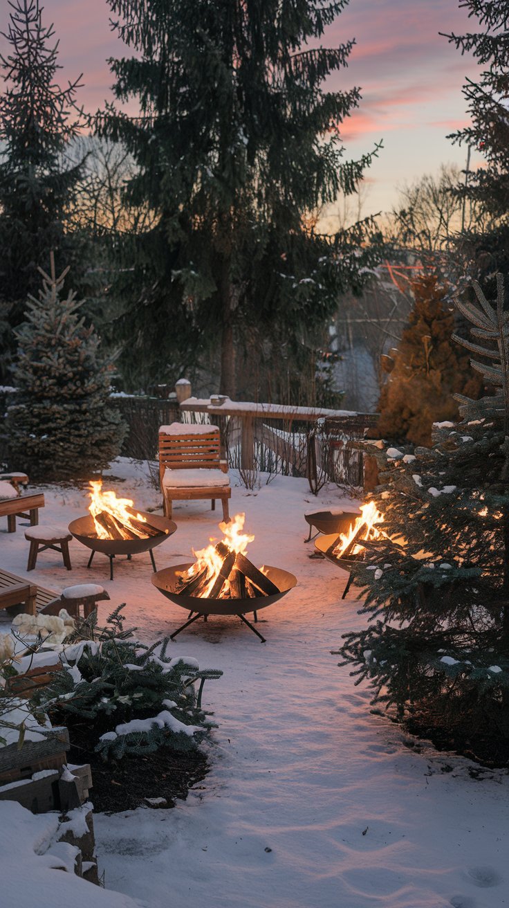 Stay warm while enjoying the winter scenery with a fire pit surrounded by evergreen trees. Arrange seating with warm throws and cushions to create a snug retreat. The contrast of the flickering flames against the frosty backdrop is both comforting and captivating. It s the perfect setup for gathering friends and family for winter storytelling or roasting marshmallows.