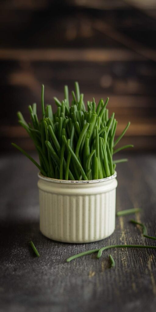 Chives add a mild onion flavor to your dishes. They grow well in small pots and are perfect for sprinkling on baked potatoes and omelets.