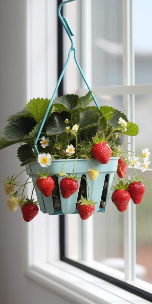 Strawberries can be grown in hanging baskets or pots near a sunny window. Choose everbearing varieties for a continuous harvest.