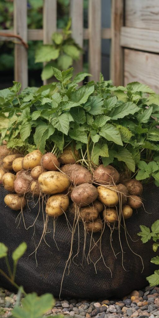 Potatoes can be grown in large containers or grow bags. Harvesting fresh potatoes is both fun and rewarding.