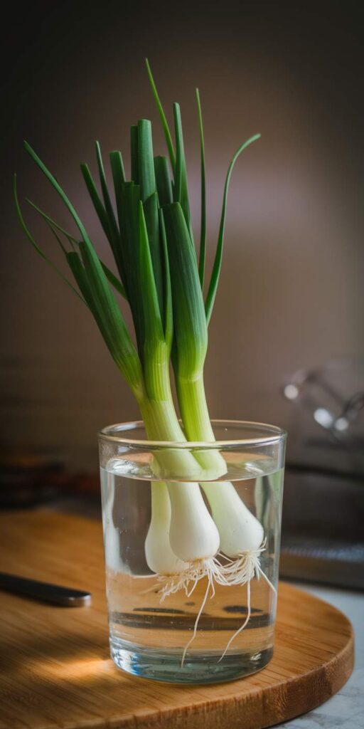 Green onions are incredibly easy to grow from scraps. Place the root ends in water, and theyll regrow in no time.