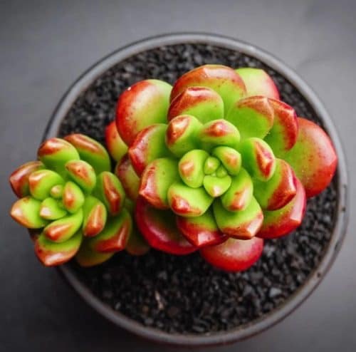 This gorgeous variety has droplet-like globular bumps near the tips of light-green foliage with red edges. The leaves change color to red or pink in bright light and cold weather.